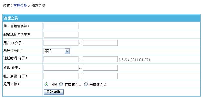 本功能为对前台会员的帐号进行批量删除。