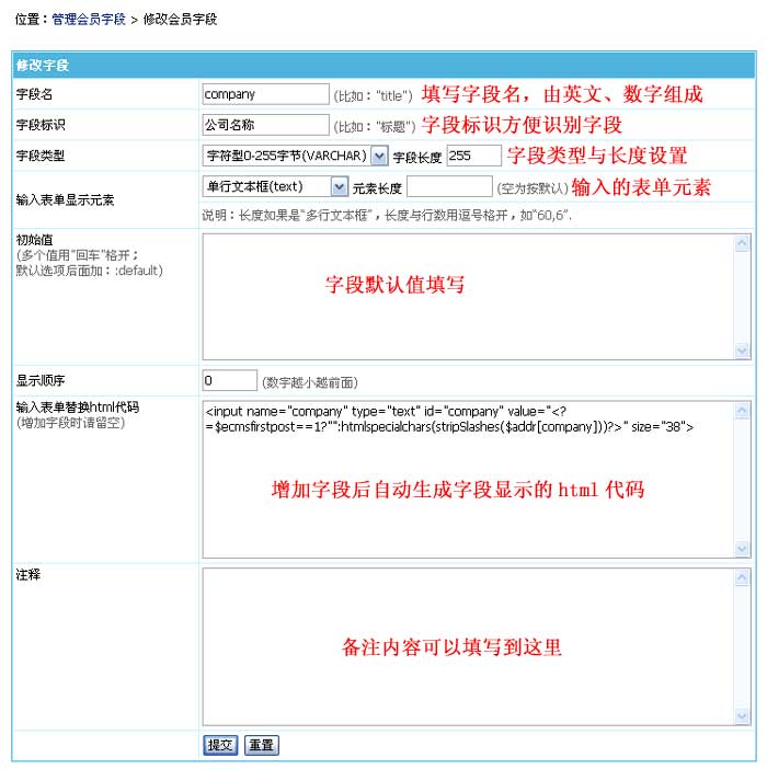 增加字段后自动生成字段显示的html代码内容,增加字段时一般不设置,可增加字段后再修改。 |