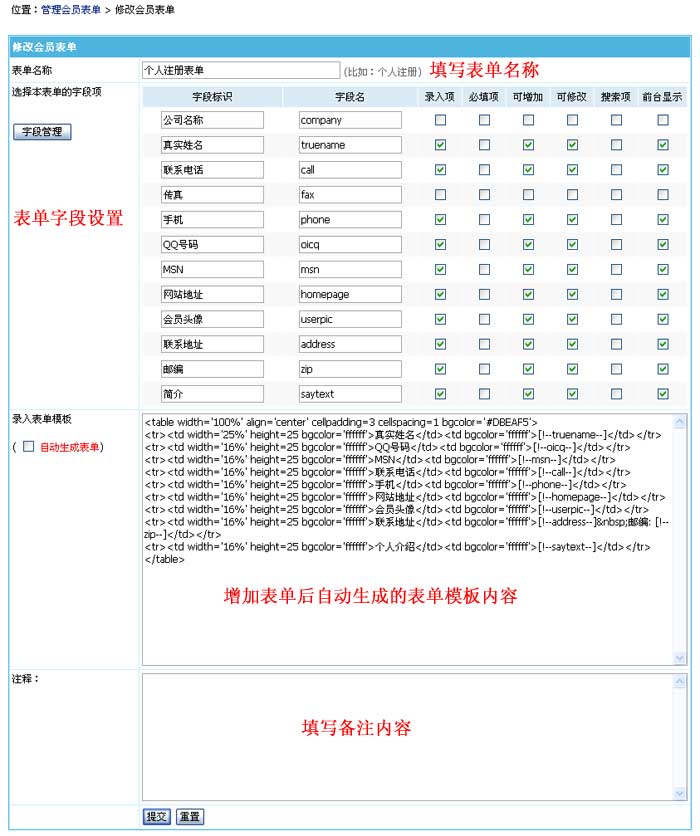 增加表单后自动生成的表单模板内容,增加表单时一般不设置,可增加表单后再修改。 |