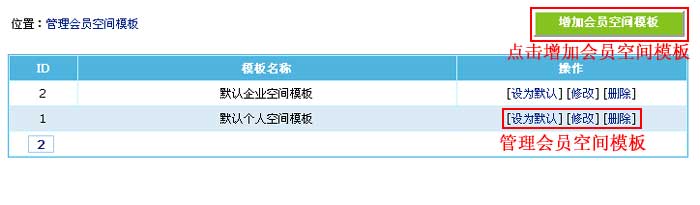 | 1、登录后台,单击“用户”菜单,选择“管理空间模板”子菜单,进入管理空间模板界面: |