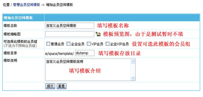 | 2、模板制作好后,管录后台进入用户 -> 管理空间模板 -> 增加会员空间模板,进入增加会员空间模板页面: | ||||||||||