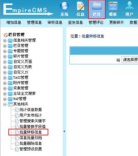 批量转移信息为将某一栏目的所有信息转移到另一个栏目的功能。