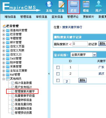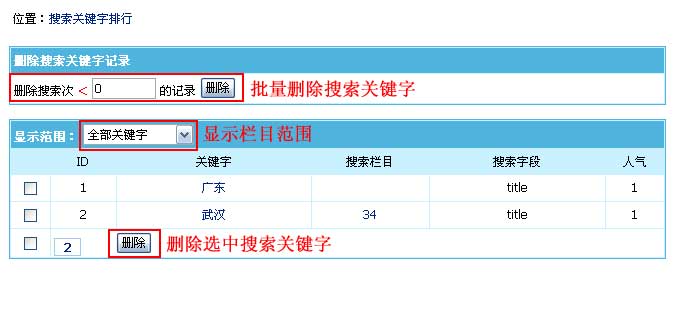 搜索关键字管理为对网站前台搜索关键字记录的管理。