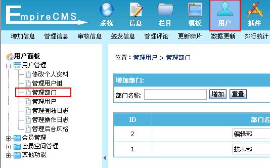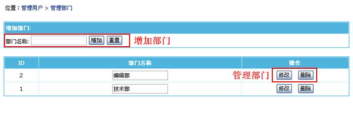 ”子菜单,进入管理部门界面: