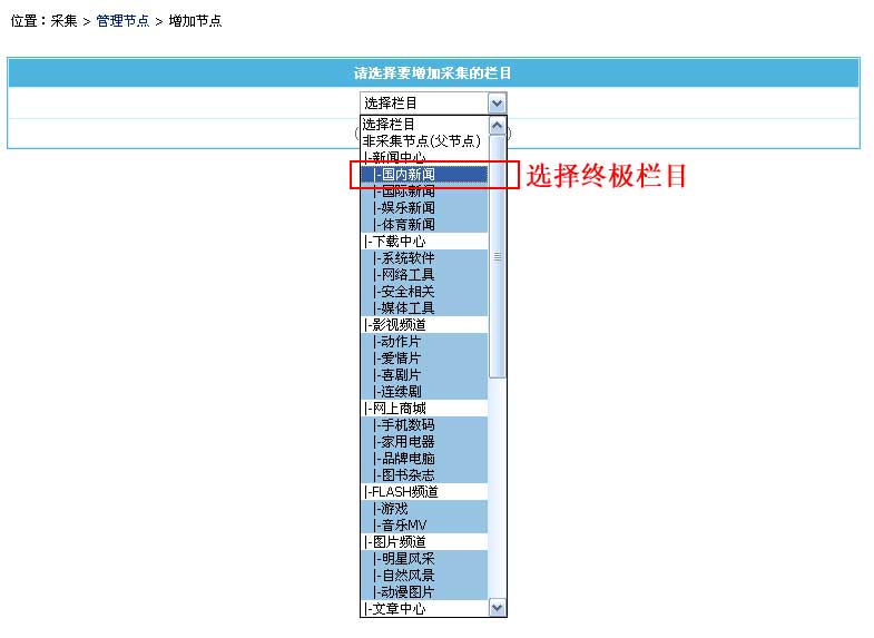 | 3、“选择要增加采集的栏目”后进入增加采集节点页面; |