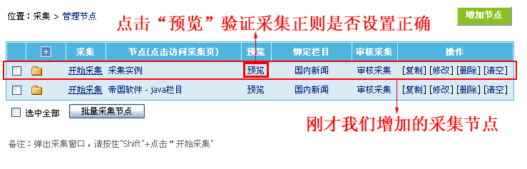 | 1、上面的采集节点正则预览无误后,我们返回“管理节点”页面: |