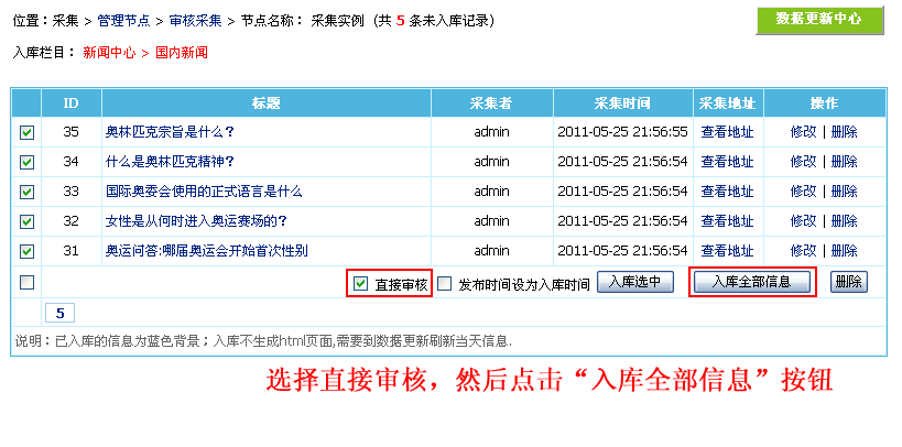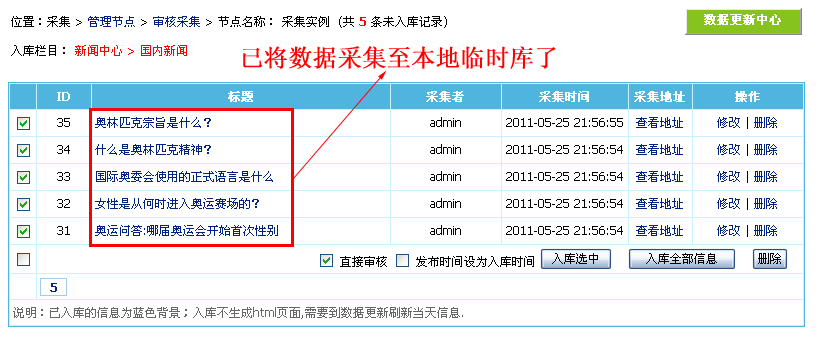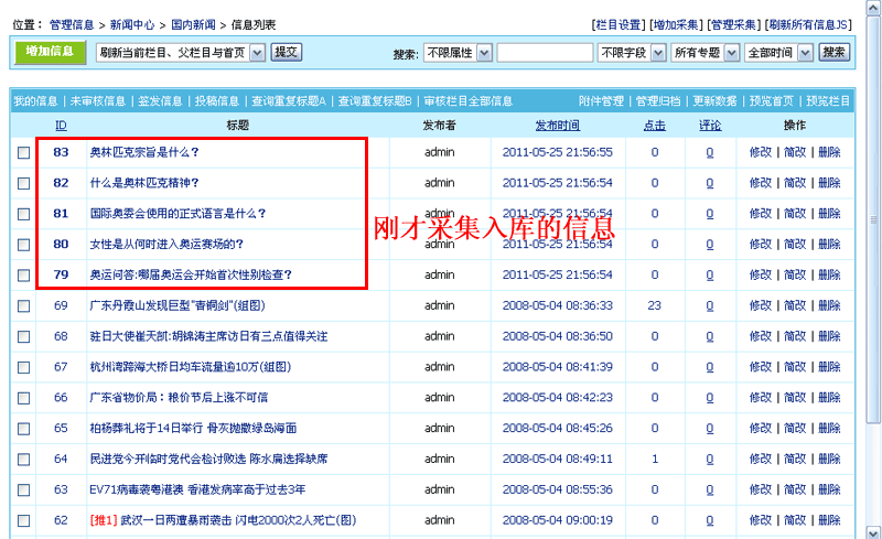 ![]() 即可完成入库操作: 管理栏目信息也可以看到我们刚才入库的信息: |