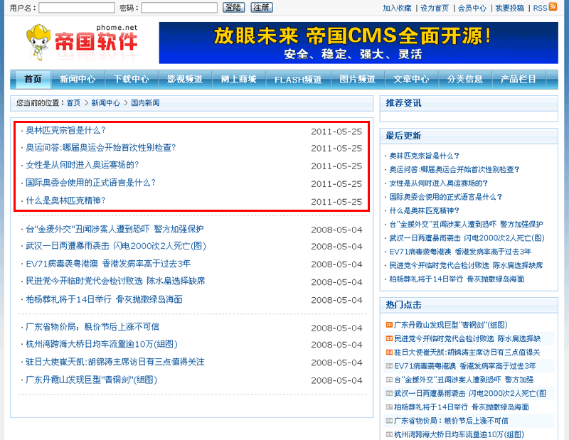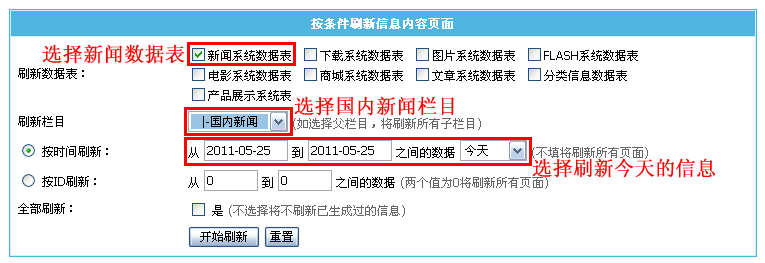 | 2、生成栏目页:“刷新多栏目页面”选择“国内新闻”这个栏目,然后点击“开始刷新”。 |