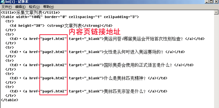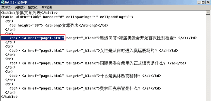 | (3)、由列表页的源代码:“<a href="page1.html" target="_blank">”,我们得出“内容页地址前缀”为:http://www.phome.net/tmp/cjpage/ |