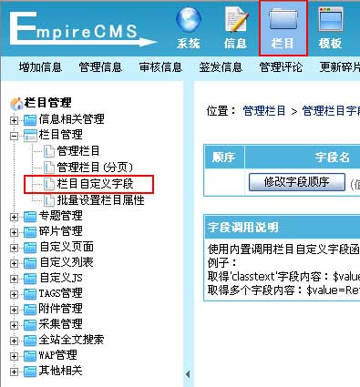 | 1、登录后台,单击“栏目”菜单,选择“栏目自定义字段”子菜单,进入管理栏目字段界面: | ||||||||||||||||||||