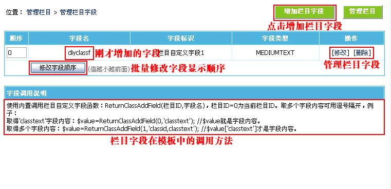 | 1、增加栏目字段后,返回管理栏目字段界面,就可以看到我们增加的字段: |