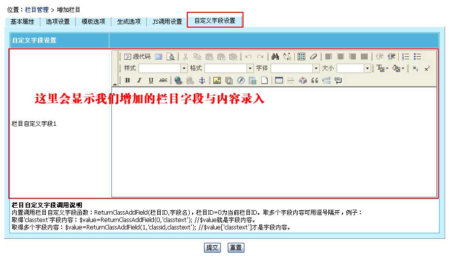 | 2、增加/修改栏目页面也可以看到我们增加的栏目字段,如图: |