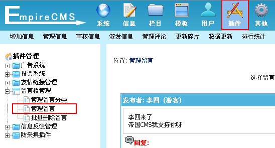 | 1、登录后台,单击“插件”菜单,选择“管理留言”子菜单,进入管理留言界面: | ||||||||||