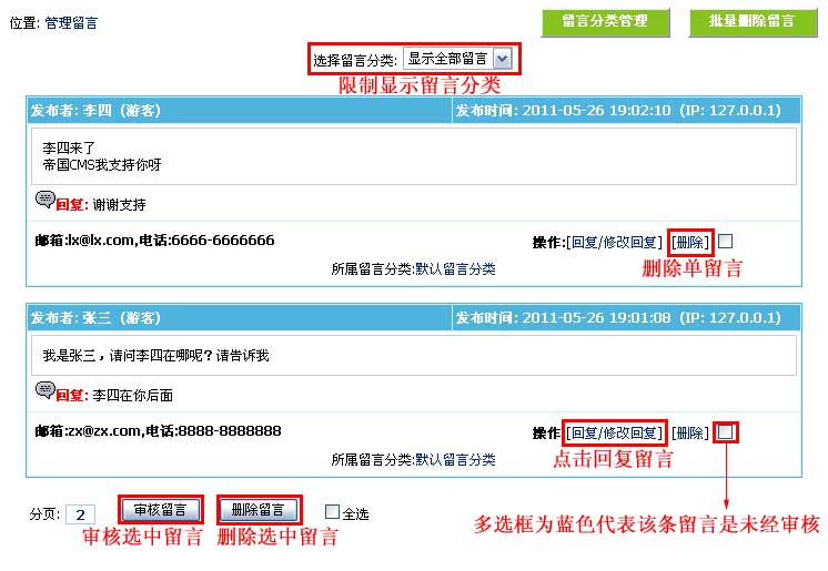 | 2、进入管理留言界面,如下图: | ||||||||||