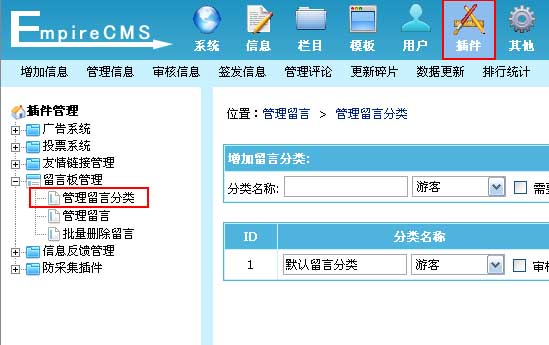 | (一)、登录后台,单击“插件”菜单,选择“管理留言分类”子菜单,进入管理留言分类界面: |