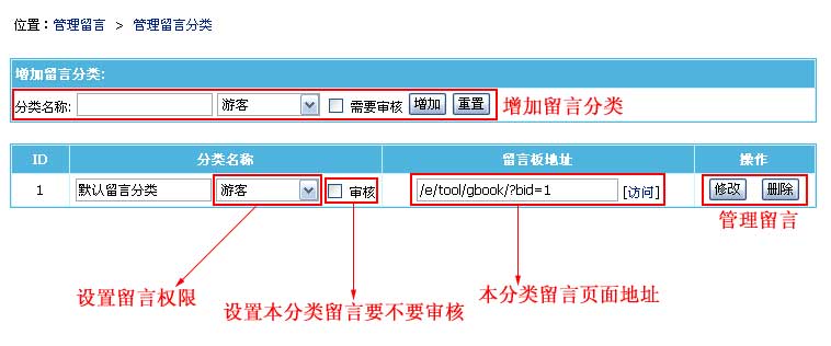 | 前台各留言板的访问地址:“/e/tool/gbook/?bid=分类ID”。 |