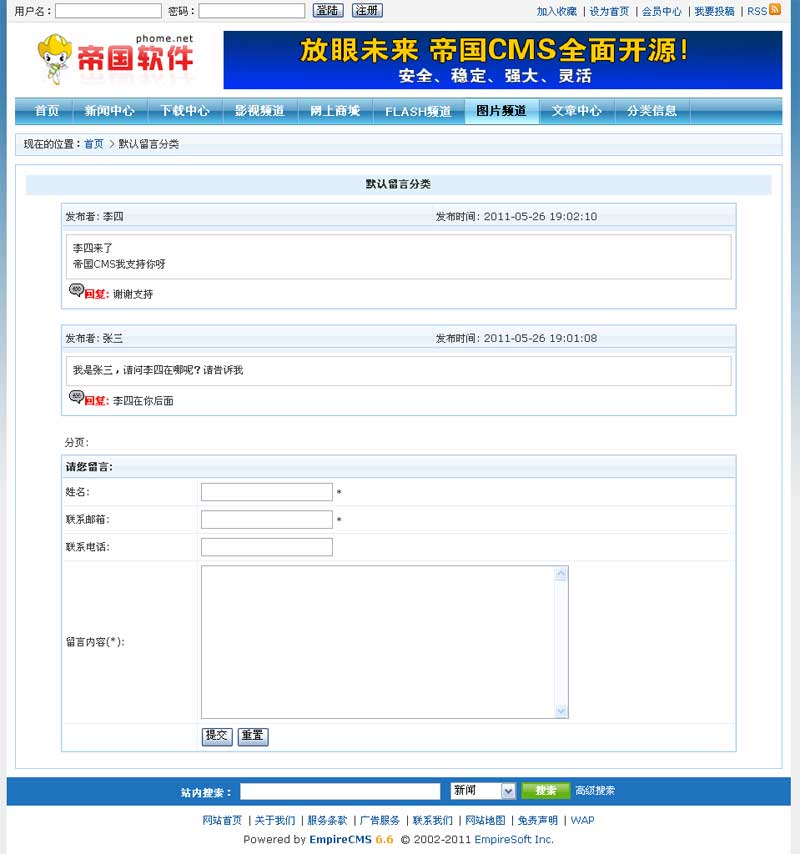 | 帝国CMS的留言板系统支持多分类,一个分类为一个单独的留言板。 |