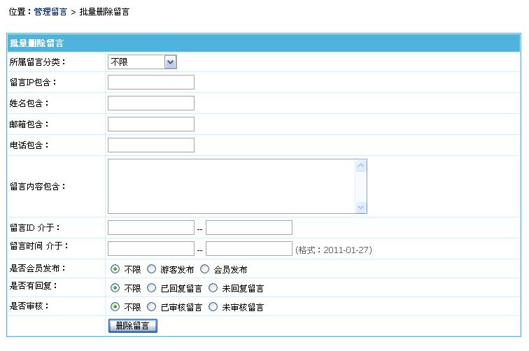 | 按条件批量删除留言功能,清理留言更便捷。 | ||||||||||||||||||||||