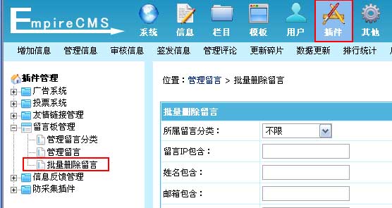 | 1、登录后台,单击“插件”菜单,选择“批量删除留言”子菜单,进入批量删除留言界面: | ||||||||||||||||||||||