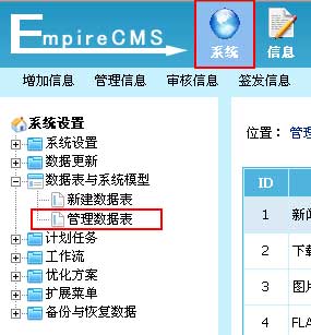 | 1、登录后台,单击“系统”菜单,选择“管理数据表”子菜单,进入管理数据表界面: | ||||||
