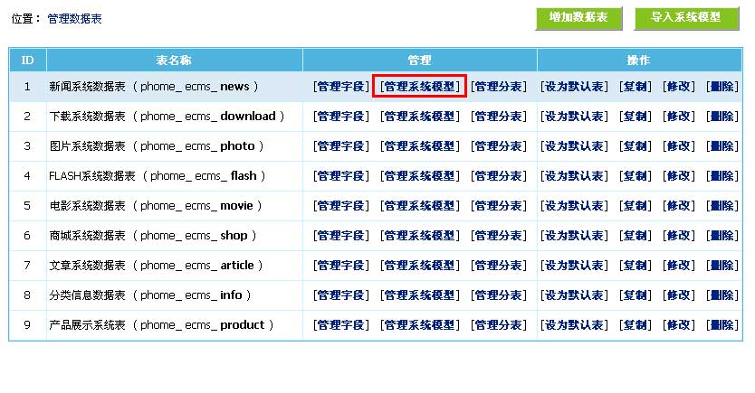 | 3、从管理数据表页面点击“新闻系统数据表”的“[管理系统模型]”,进入管理系统模型页面: | ||||||