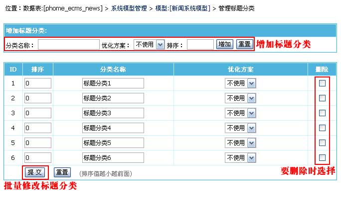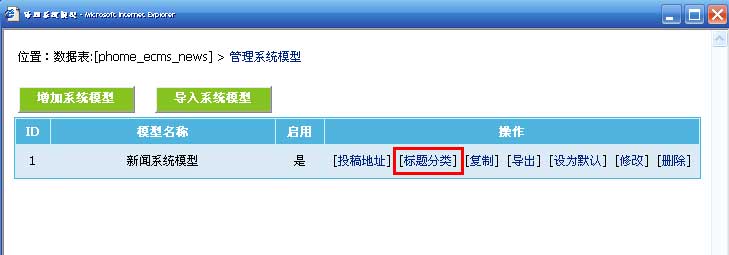 | 4、从管理系统模型页面,点击“[标题分类]”,进入标题分类管理: | ||||||