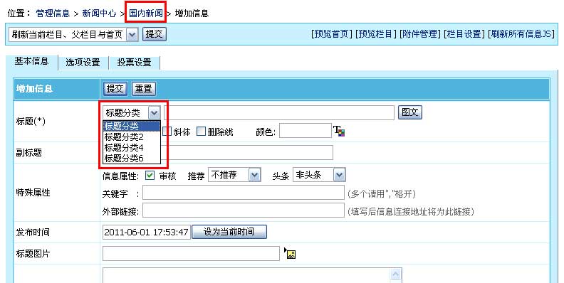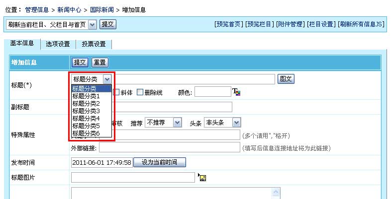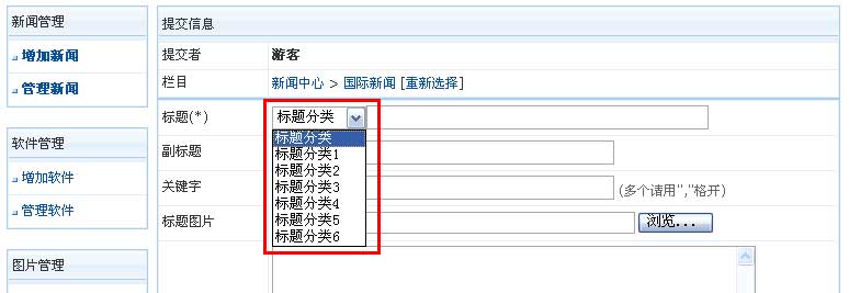 | 5、增加标题分类后,增加/修改信息页面就可以选择我们增加的标题分类,如下图: | ||||||