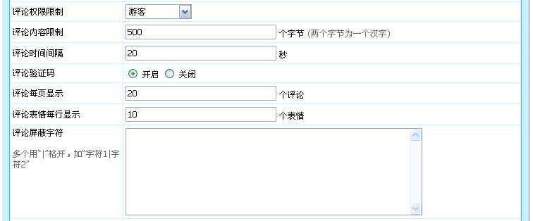 | 设置评论过滤字符:设置评论不允许提交的内容。 |