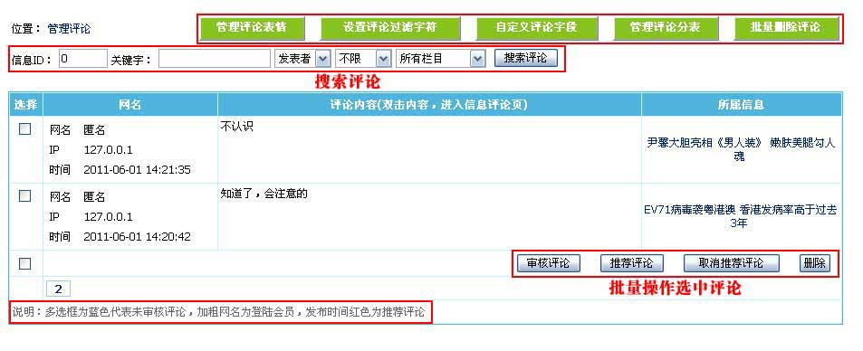 | 2、进入管理评论界面,如下图: | ||||||||||||||||||||||||||||||||
