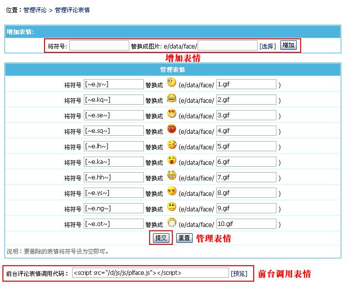 | 管理评论表情:对评论内容插入的表情进行管理。 |