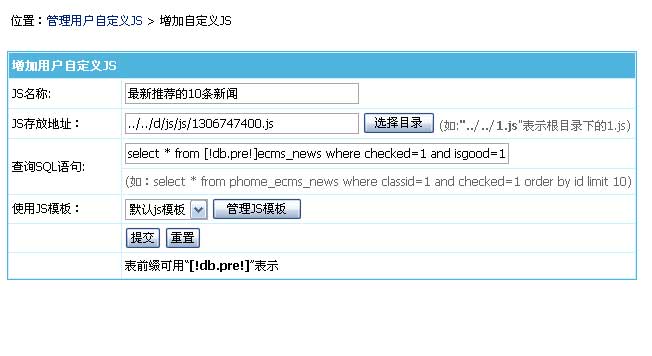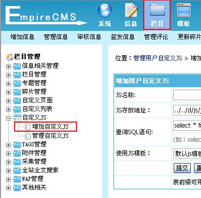 填写JS文件存放地址(地址从后台目录开始算,“../../”表示在根目录)。