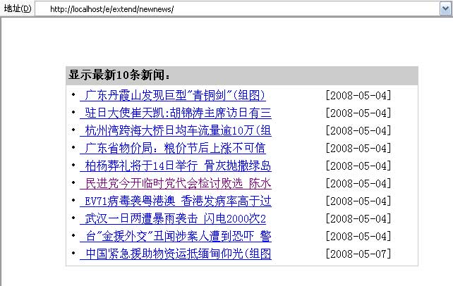 <!DOCTYPE HTML PUBLIC "-//W3C//DTD HTML 4.01 Transitional//EN"> <html> <head> <meta http-equiv="Content-Type" content="text/html; charset=gb2312"> <title>显示最新10条新闻例子</title> </head> <body> <br> <br> <br> <table width="500" border="0" align="center" cellpadding="3" cellspacing="1" bgcolor="#CCCCCC"> <tr> <td height="25"><strong>显示最新10条新闻:</strong></td> </tr> <tr> <td height="25" bgcolor="#FFFFFF">