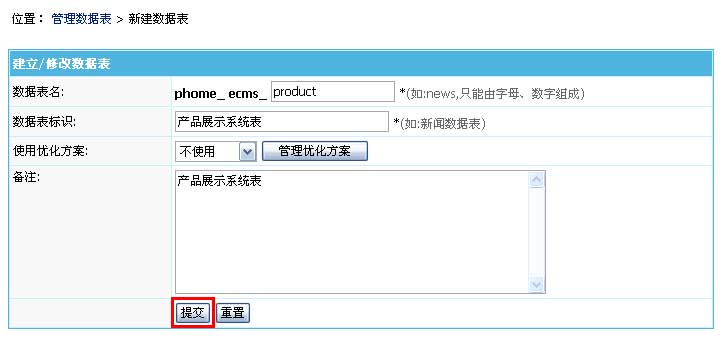 | 2、提交后,数据表即可增加成功,转至“管理数据表”会显示刚才新建的表,如下图: | ||||||||||||||||||||||||||||||||||||||||||||||||||||||||||||||||||||||