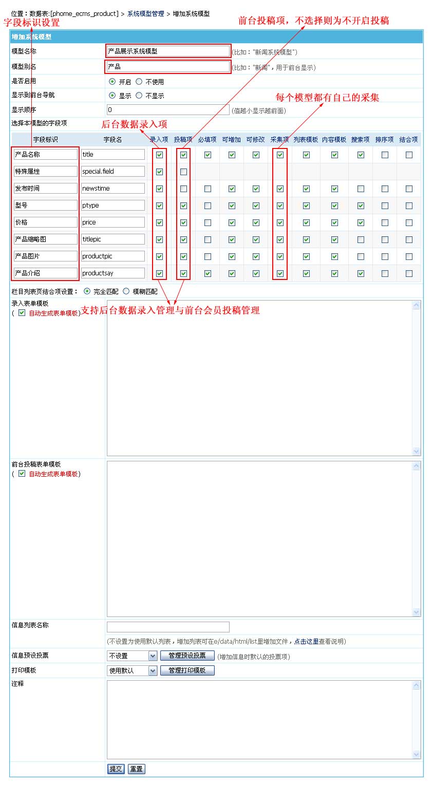 | 说明:每个系统模型都可以有自己的“后台信息发布与管理”、“前台会员投稿与管理”与“信息采集”。 | ||||||||||||||||||||||||||||||||||||||||||||||||||||||||||||||||||||||