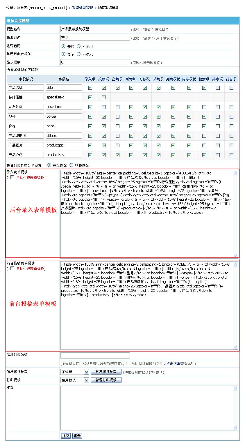 | 1、登录后台->“系统”->“数据表与系统模型”->“管理数据表”->点击产品数据表的“管理系统模型”->“增加系统模型”,进入如下界面: | ||||||||||||||||||||||||||||||||||||||||||||||||||||||||||||||||||||||
