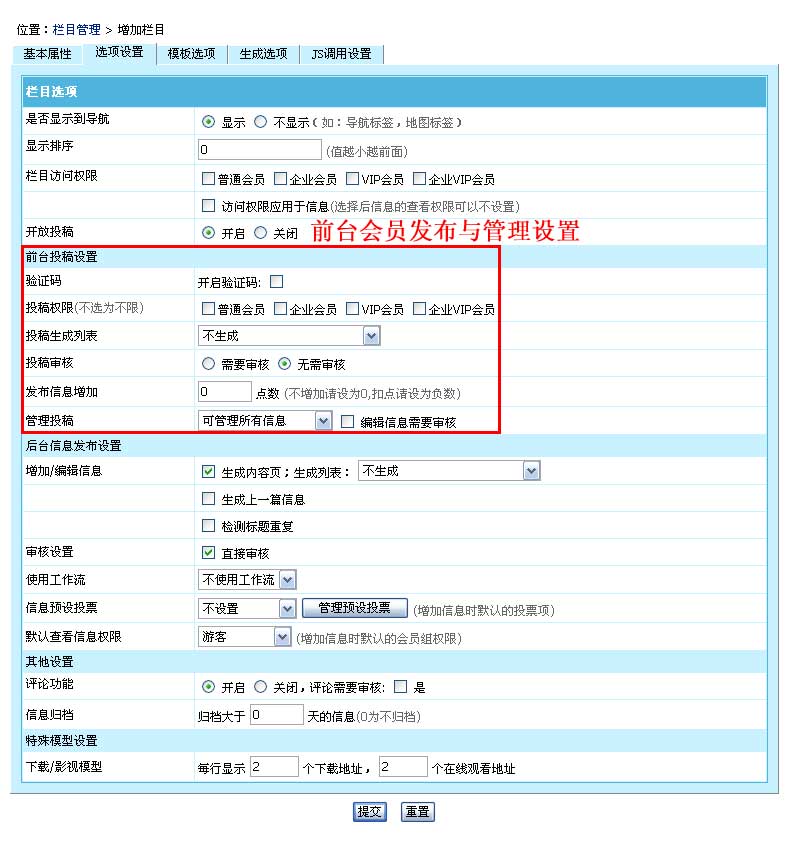 图1:(选择“产品展示系统模型”)![]() 图2:(如果要开启前台会员发布与管理,可仔细设置下面的选项) |