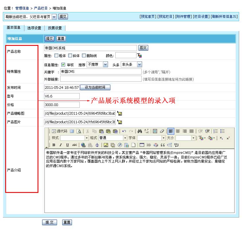 | 说明:由于只是教程,所以我们下面只实例制作比较简单的产品系统,用户也可以依自己实际情况增加产品参数字段。 | ||||||||||||||||||||||||||||||||||||||||||||||||||||||||||||||||||||||