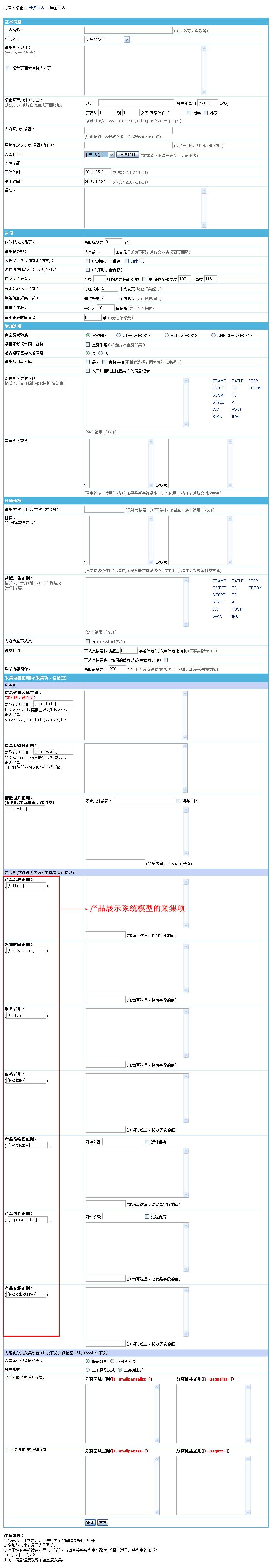 | 登录后台->“栏目”->“采集管理”->“增加采集节点”->选择“产品栏目”,进入如下界面: |