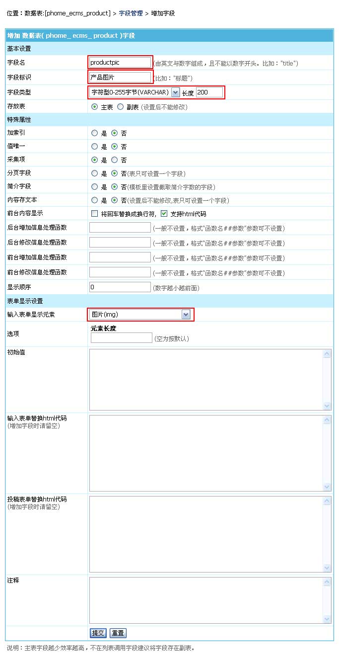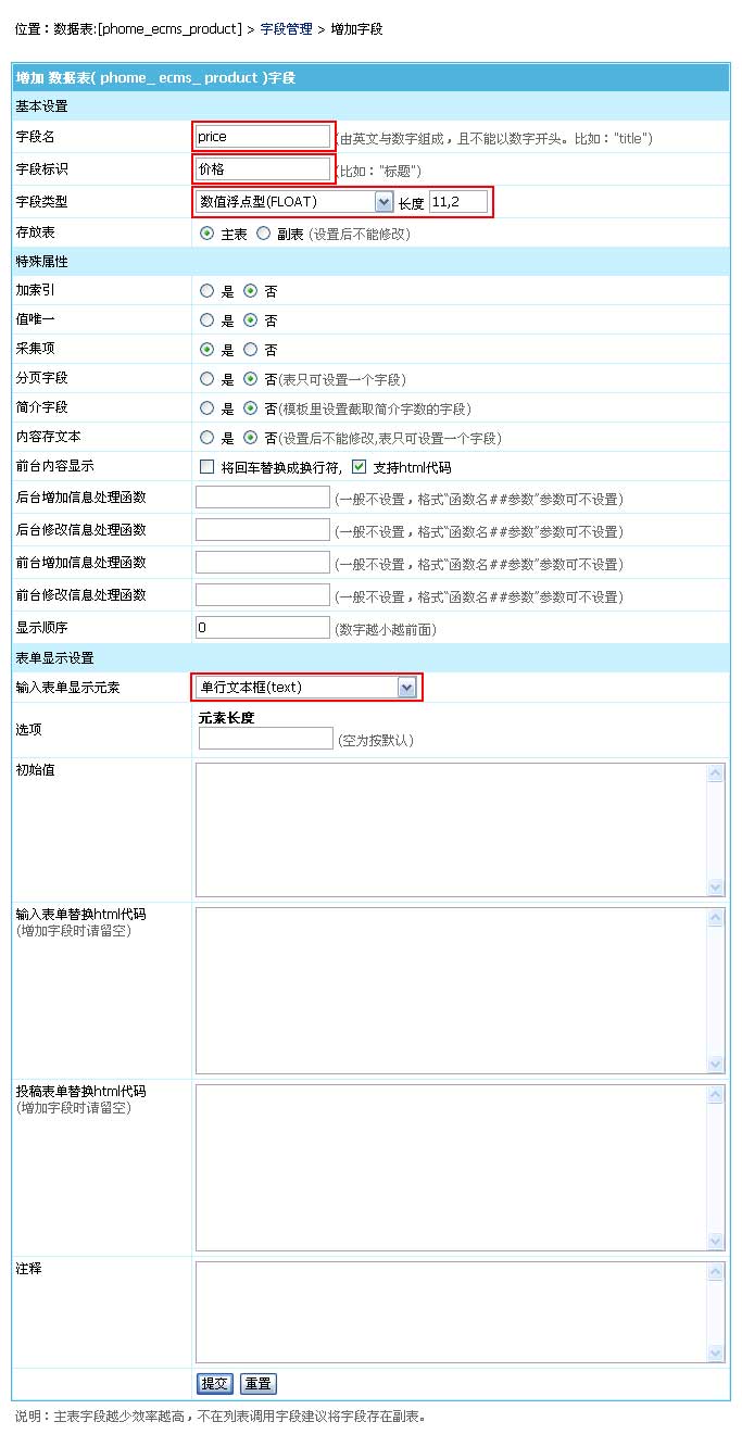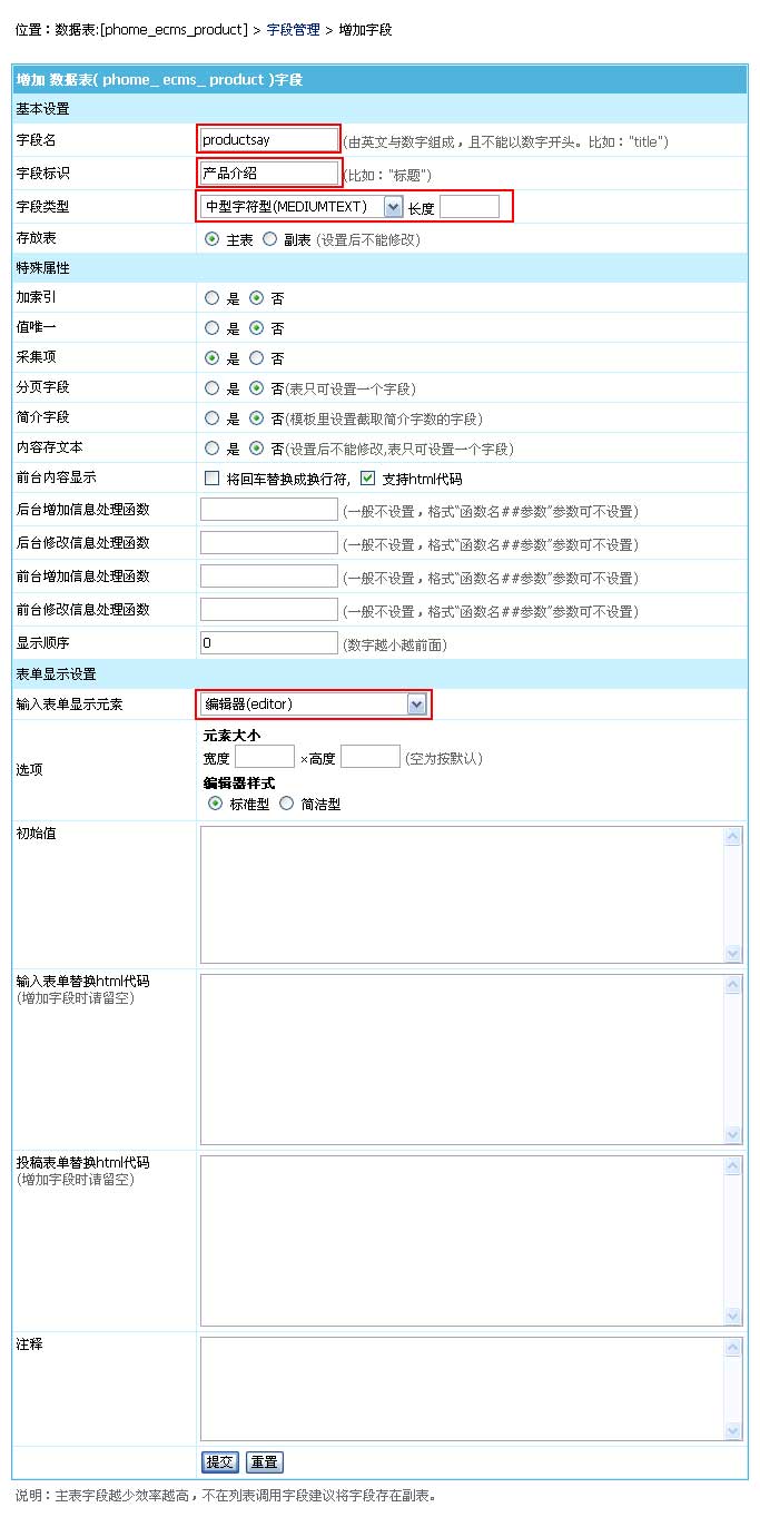 | 1、登录后台->“系统”->“数据表与系统模型”->“管理数据表”->点击产品数据表的“管理字段”->“增加字段”,进入如下界面: | ||||||||||||||||||||||||||||||||||||||||||||||||||||||||||||||||||||||