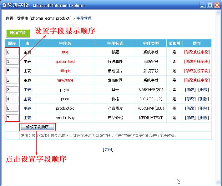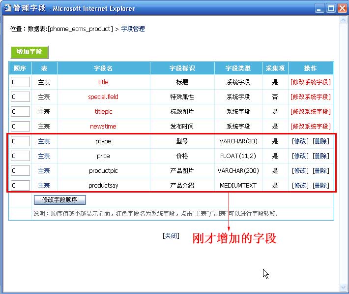 | (三)、增加字段:由于产品名称与产品缩略图是系统内置字段,所以下面我们增加其余字段。 | ||||||||||||||||||||||||||||||||||||||||||||||||||||||||||||||||||||||