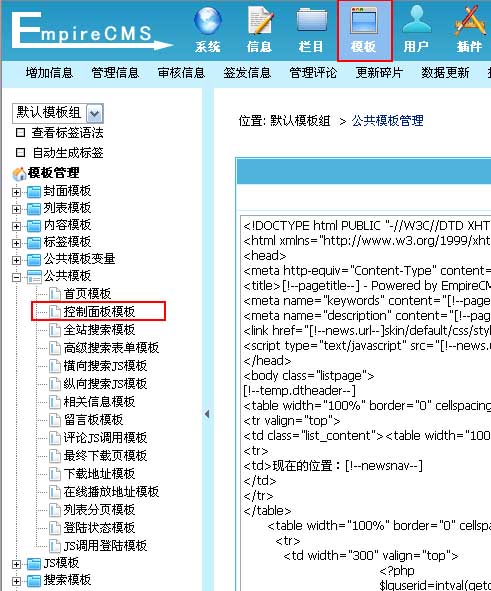 | 1、登录后台,单击“模板”菜单,选择“控制面板模板”子菜单,进入修改控制面板模板界面: |