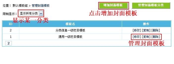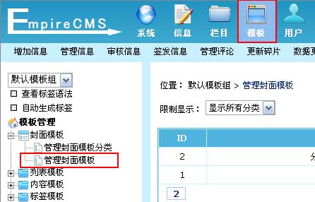| 1、登录后台,单击“模板”菜单,选择“管理封面模板”子菜单,进入管理封面模板界面: |