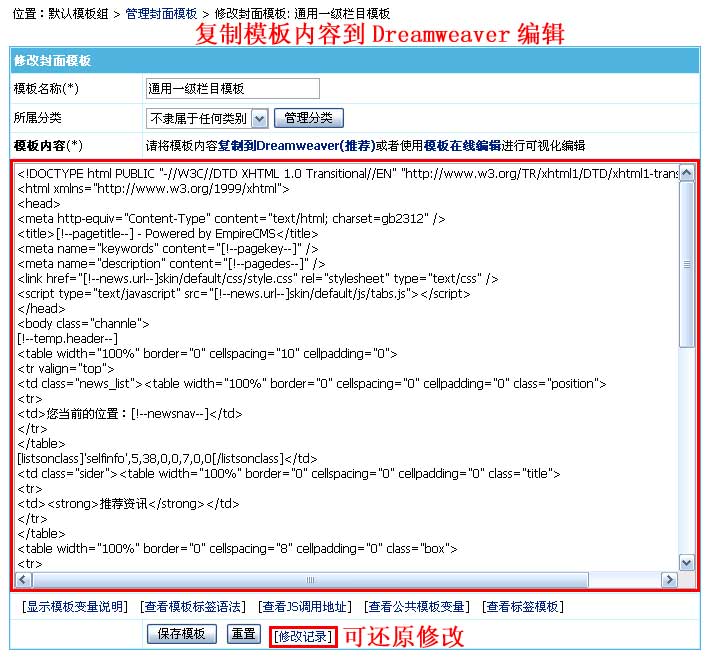 | 5、修改模板后,复制页面的代码到后台的模板内容文本框,然后点击“修改”即可修改完毕。 |