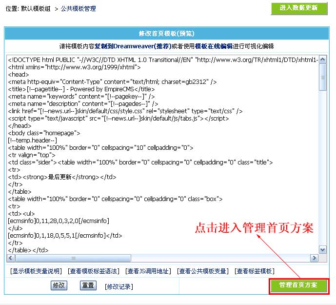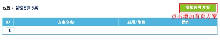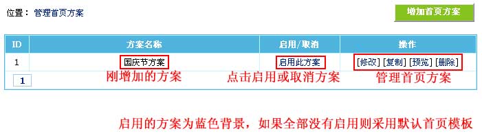 (启用的方案为蓝色背景,如果全部方案没有启用则采用默认首页模板。)