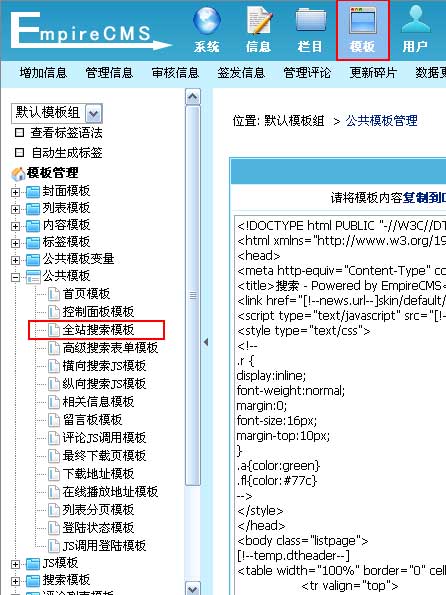 | 1、登录后台,单击“模板”菜单,选择“全站搜索模板”子菜单,进入修改全站搜索模板界面: | ||||