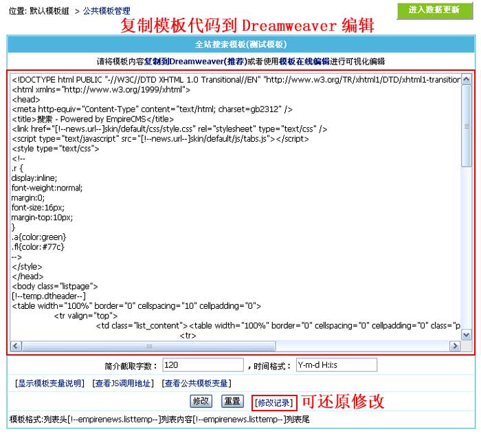| 2、进入“修改全站搜索模板”界面,将模板代码复制到Dreamweaver编辑,如下图: | ||||