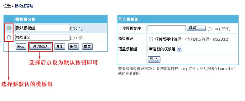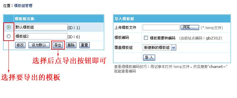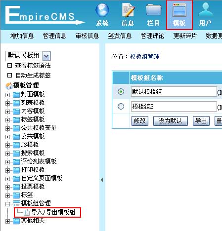 | 1、登录后台,单击“模板”菜单,选择“导入/导出模板组”子菜单,进入模板组管理界面: | ||||||