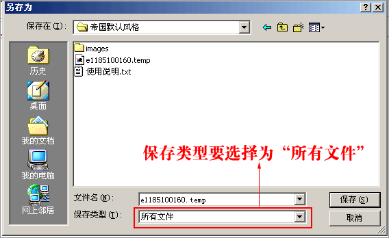 | 3、保存导出的模板文件,(保存类型要选择为所有文件)。如下图: | |