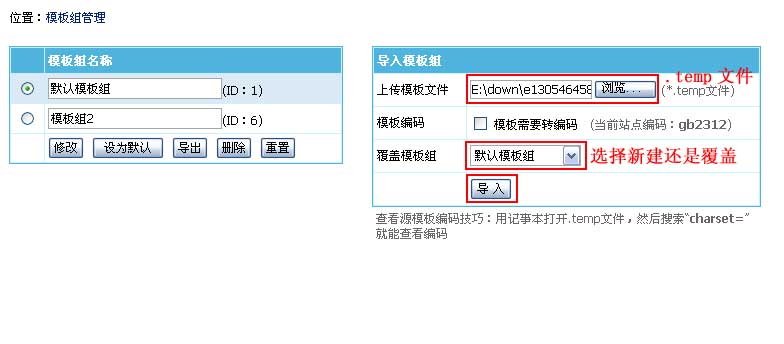 | 2、进入模板组管理界面,选择要导入的模板.temp文件,然后点击导入按钮即可。如下图: | ||||||